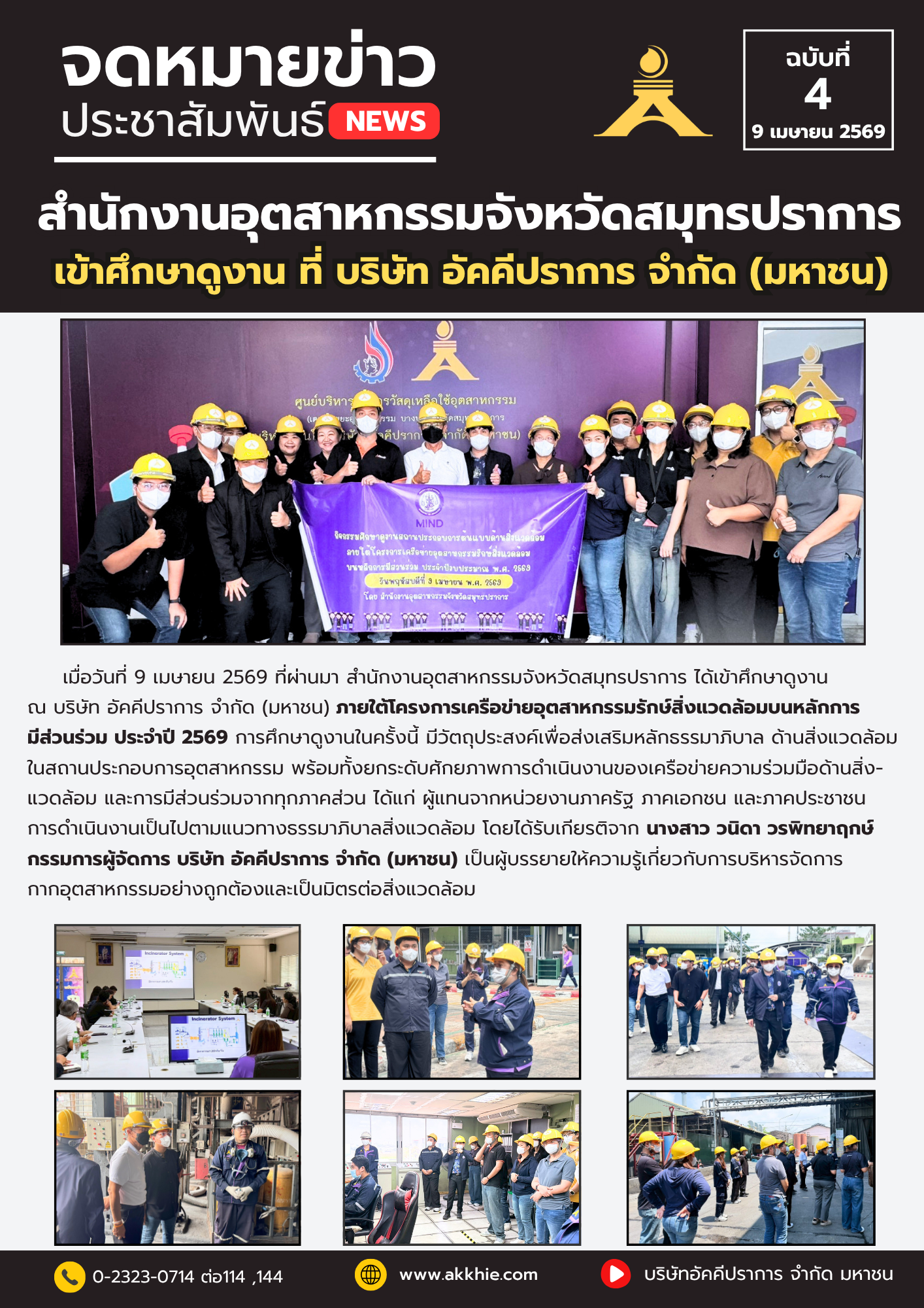 เมื่อวันที่ 9 เมษายน 2569 ที่ผ่านมา สำนักงานอุตสาหกรรมจังหวัดสมุทรปราการ ได้เข้าศึกษาดูงาน ณ บริษัท อัคคีปราการ จำกัด (มหาชน) ภายใต้โครงการเครือข่ายอุตสาหกรรมรักษ์สิ่งแวดล้อมบนหลักการมีส่วนร่วม ประจำปี 2569